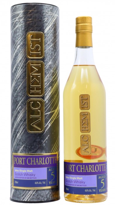 The whisky Port Charlotte 5 Year Old Alchemist is a Single Malt Scotch Whisky from Port Charlotte. At a volume of 46% ABV this whisky is bottled at an optimal drinking strength. Enjoyed neat or with a drop of water.
